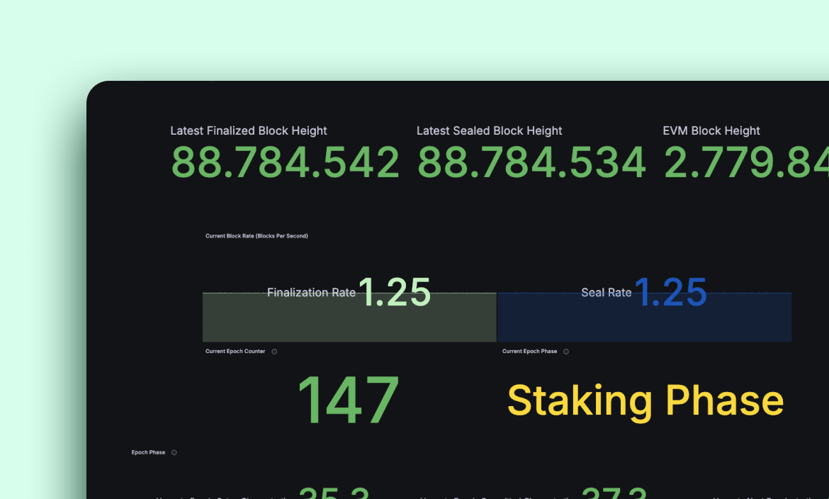 This dashboard tracks the operational health and performance of the Flow network. It shows key metrics such as network uptime, access node uptime, epoch phase, collection finalization, block finalization, transaction execution, sealing metrics, and the consensus leaderboard.