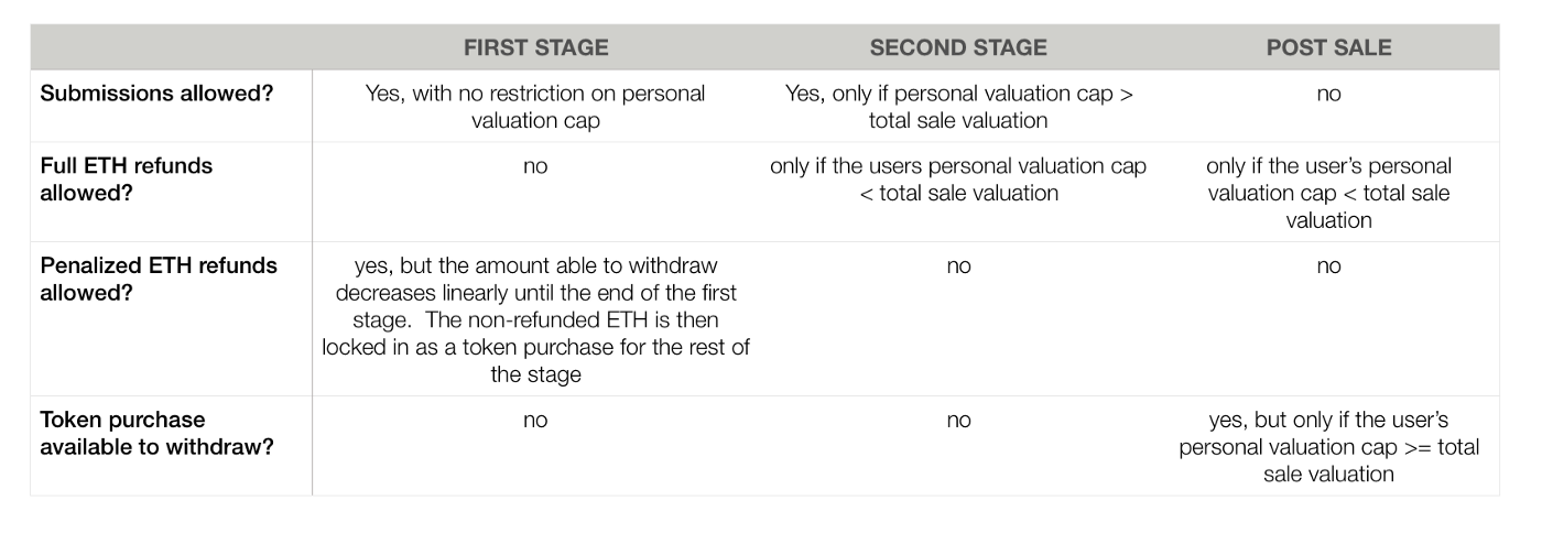 The Interactive initial coin offering protocol (IICO) allows participants to submit a bid with what is called a personal valuation cap, in addition to the regular ETH payment for tokens. These bids ensure that the user gets a fair token purchase or refund based on their expectations for the sale valuation. Users also can withdraw their bids throughout the first stage of the sale for a partial refund.