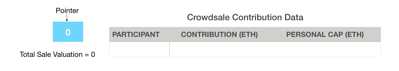 You might be confused that the pointer isn’t equal to the current valuation. The reason for this is that the pointer needs to always point at one of the personal valuation caps, indicating which cap is the cutoff to remain in the sale. This is slightly different than what is specified in section 4 of the technical paper, but necessary for proper functionality of the pointer mechanism and ensuring monotonically increasing sale valuation.