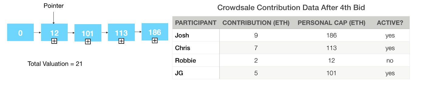 Every time a new bid is submitted, its personal valuation cap is added to the sorted linked list of personal valuation caps. Then the contract adds its bid to a sum of all bids submitted with that same personal valuation cap. After that, it records the amount of ETH submitted in that bid and the token price bonus at the time the bid was submitted.