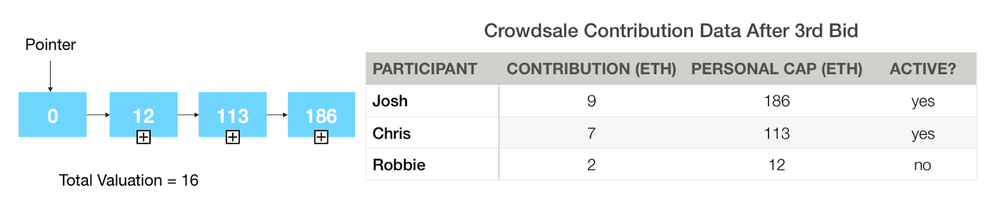 As you can see, Robbie’s bid with a personal valuation cap less than the total sale valuation is still recorded in the list and storage, but does not affect the total sale valuation or pointer at all. When another bid comes in, the pointer is moved to 12 to show that personal valuation caps of 12 and lower are not involved in the sale.