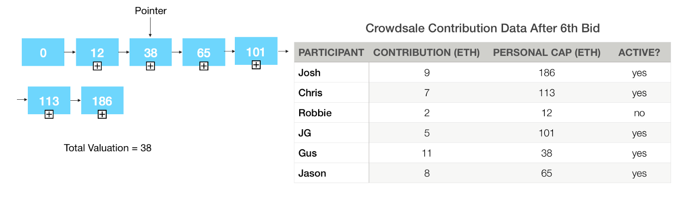 As you can see, Josh has contributed 9 ETH, so the total sale valuation has increased to 9. His personal valuation cap was added to the sorted list of caps, but since the total sale valuation is still less than his cap, the pointer is still pointing at zero, showing that all bids still remain in the sale.