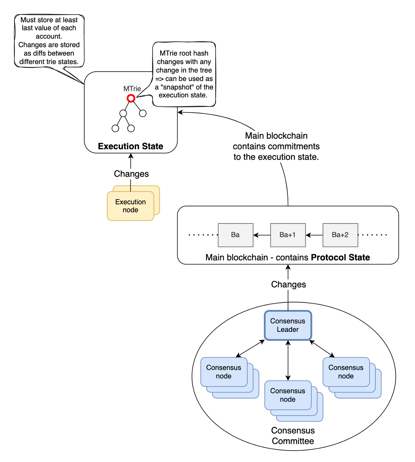 The Execution State is a data structure called Memory-trie (MTrie), containing all data that is manipulated via Cadence smart contracts (account token balances, NFTs, smart contracts deployed …). Whenever a collection is executed an updated MTrie is generated. The new state of the MTrie data can be referenced via single hash (root-node hash). This hash is the Execution Result that the execution node commits to (Execution commitment) which gets added to a block by the consensus leader so that it can be validated.