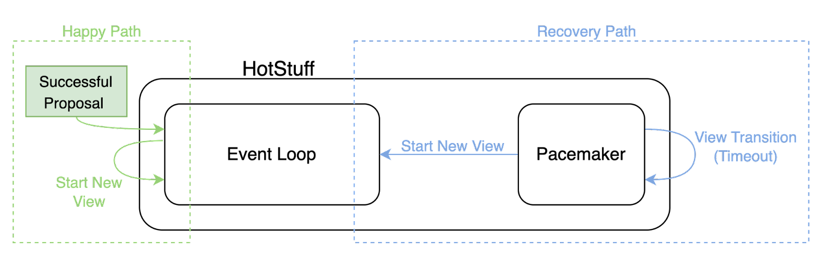 Of particular interest to the latest upgrade is a component in HotStuff called the Pacemaker. Each node maintains a local current_view variable which is incremented when observing successful proposals for their current (or greater) view, or when indicated by the Pacemaker. The Pacemaker is responsible for ensuring individual nodes agree on the current view, so they can make progress together.
