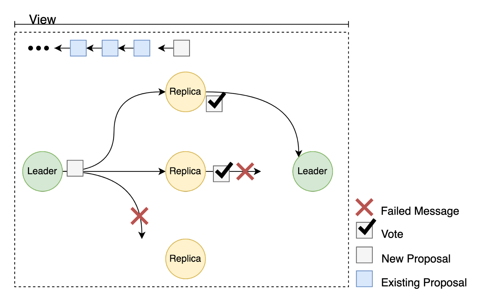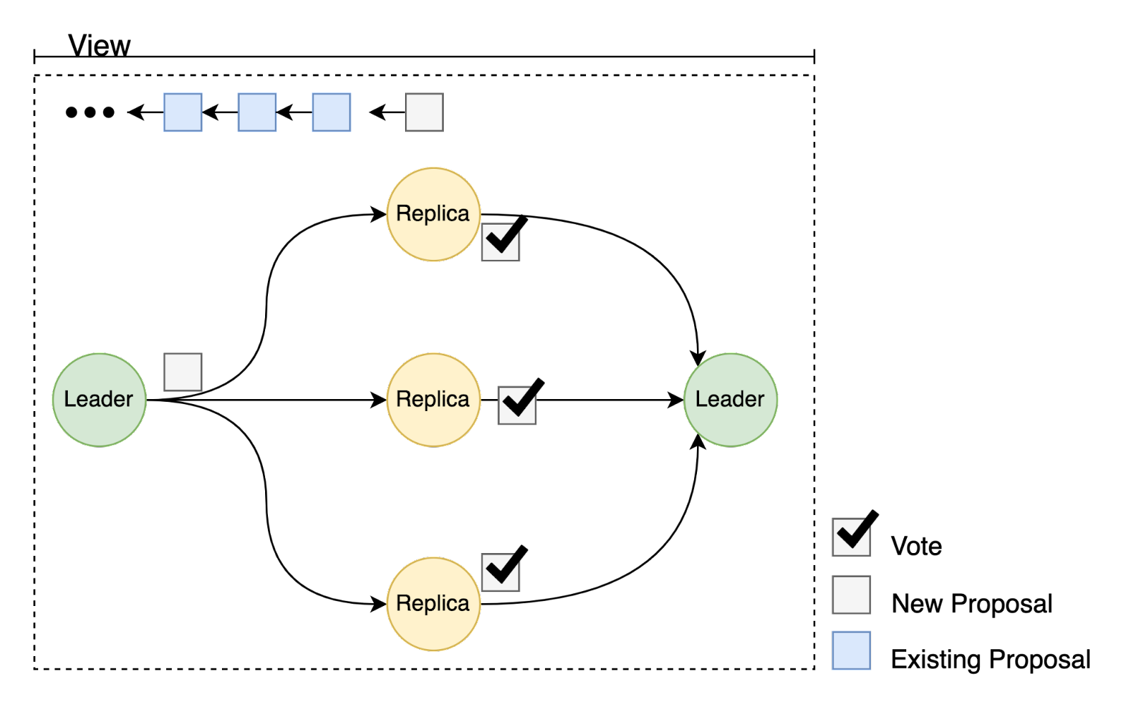 The HotStuff protocol proceeds in a series of rounds (often called views) in which one node is the leader and may propose a new block by extending a previously proposed block. A new leader is selected for each subsequent round. (In the following diagrams, nodes other than the leader are referred to as replicas.) In the happy-path, a supermajority[2] of the committee will accept the block by voting for it. We refer to this as a successful round.