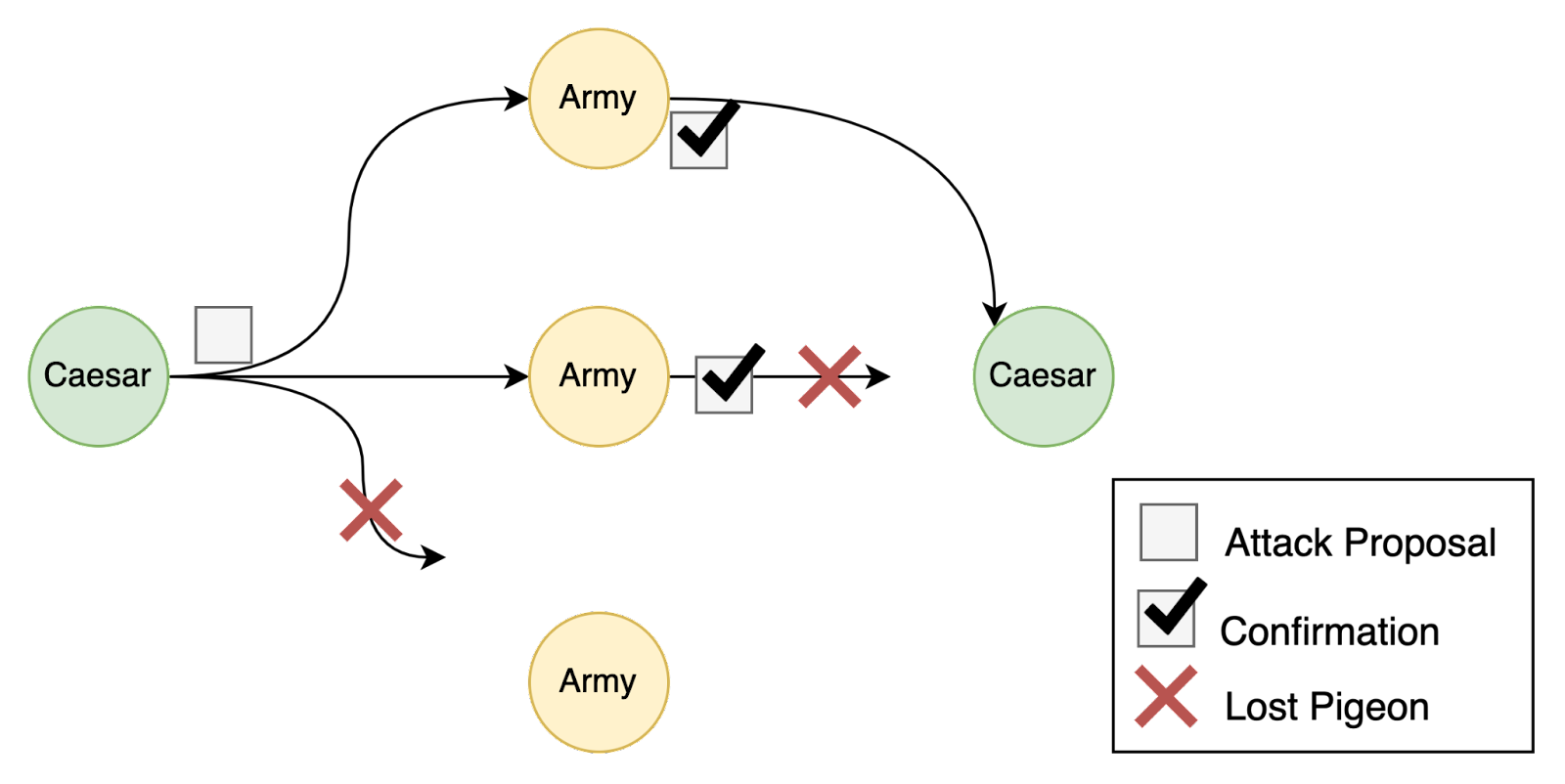 At sunrise, Caesar sends a proposal to attack at 8PM to all the armies. Our army sends a response saying that we are ready to attack at 8PM. At this point, we know only that our army and Caesar agree on the attack time. We aren't sure whether the other armies received Caesar's proposal, or even if Caesar received our response, so it isn't safe for us to commit to an attack.