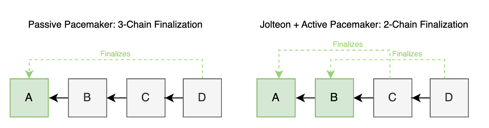 Up to this point, Flow's consensus has required 3 successful confirmations for a block to be finalized. With the Jolteon upgrade, finalization can be achieved after only two confirmations. This difference is achievable because of the introduction of the Active Pacemaker. The addition to the protocol of explicit communication about failed views changes the logic of safety to enable individual nodes to convince themselves of consensus on a block more quickly.