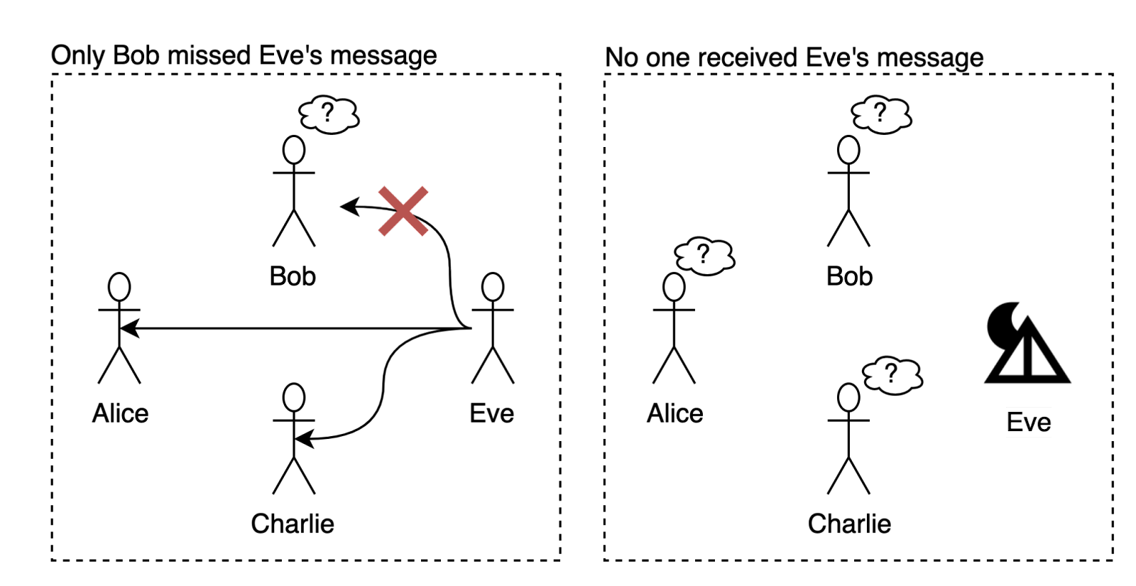 Returning to the example of friends organizing dinner, this is analogous to Bob being able to fallback to direct communication with Alice and Charlie when he does not see Eve’s message. They can quickly determine whether Eve has gone camping or whether Bob just missed her call, and decide how to proceed.