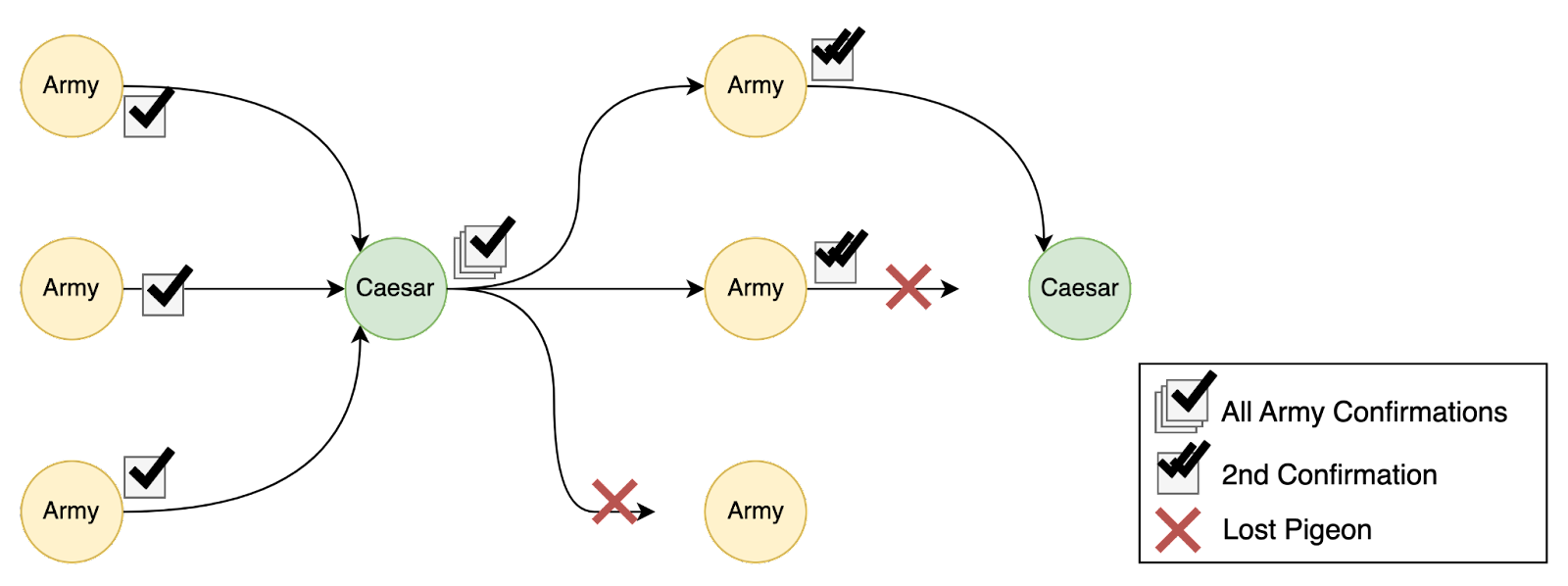 So, what do we do? One option is for Caesar to send yet another message, once he has received another round of confirmations from all armies. This message will inform us that all armies have seen the evidence of Roman consensus they need to commit to the attack. This would create a 3-chain (3 consecutive confirmations for the proposal), which is sufficient to finalize the proposal without active fallback communication.