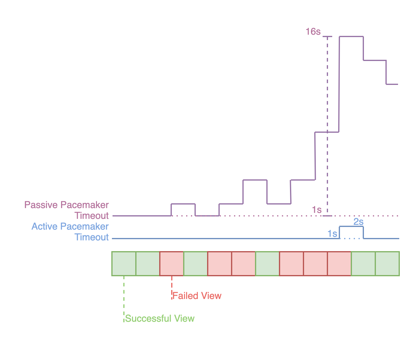 In addition, since failed views can be explicitly handled while maintaining view synchronization, we have more flexibility to adjust the timeout configuration. In any system, especially one which must account for the presence of Byzantine participants, failures are expected. Where each failed view with a Passive Pacemaker would cause a subsequent failed view to take twice as long to time out, the Active Pacemaker can allow a few consecutive failed views to pass without increasing the timeout, then only begin increasing the timeout when it appears that network conditions have durably degraded.