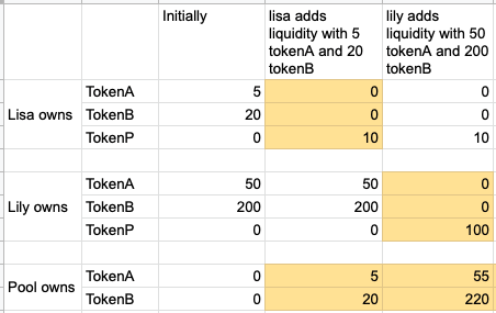 You might wonder, what if Lily tries to be foxy here: what if she adds 25 tokenA and 400 tokenB? Wouldn’t that mint the same amount of tokenP since the square root of 50*200 and 25*400 are the same?