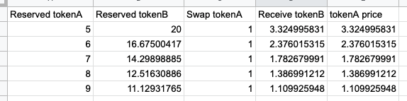 In summary, Tim swapped 1 tokenA for 3.324996 tokenB, and paid 0.003 tokenA as the fee. The swap caused tokenA’s price to drop from 4 tokenB to 3.324996 tokenB. In fact, if Tim continues to swap tokenA for tokenB, tokenA’s price will keep dropping. See the following table for the price change if Tim made 5 transactions to swap 1 tokenA for tokenB each time: