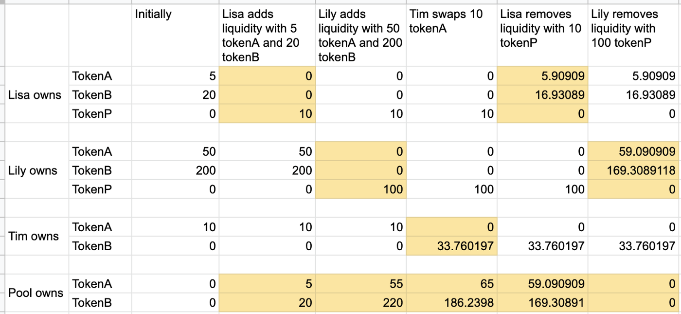 After Lisa remove all of her tokens, Lily also decides to redeem. She called removeLiquidity with all her 100 tokenP. The pool burns them and transfer 59.090909 tokenA and 169.30891 tokenB to Lily. Now, the pool has no tokenA and tokenB left (technically there is a tiny amount of each token locked to prevent issues like dividing by 0, but the amount is so small that it could be ignored. If you are interested in those details, you can see them by running my test case posted in the end).