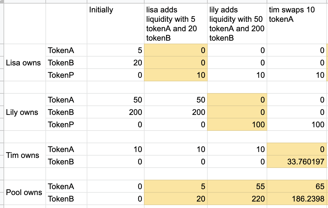 Now let’s see what happens when there are multiple liquidity providers adding tokens to the liquidity pool.