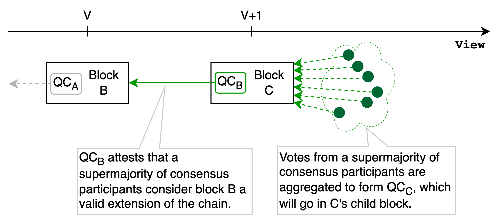 Flow employs Jolteon as its BFT consensus algorithm, which is an optimized flavor of HotStuff. In HotStuff, the QC for block B is included in B’s child block(s). A valid QC attests that a supermajority of consensus participants consider the block a valid extension of the chain. We say that a block B is certified, if and only if a valid QC for block B is known.
