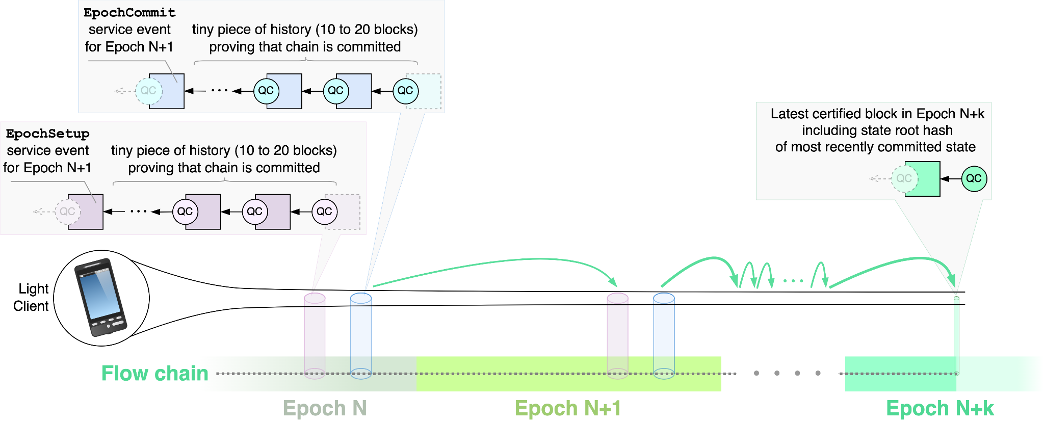 - The Follower, which knows the Identity Table for Epoch N, can assess the integrity of the response by checking the QCs and block hashes, because all the blocks it received must belong to Epoch N. If any check fails, the Follower knows it has received a corrupted response and discards it. However, if the checks pass, the Follower has cryptographic proof that the consensus committee of Epoch N committed the EpochSetup and EpochCommit events.