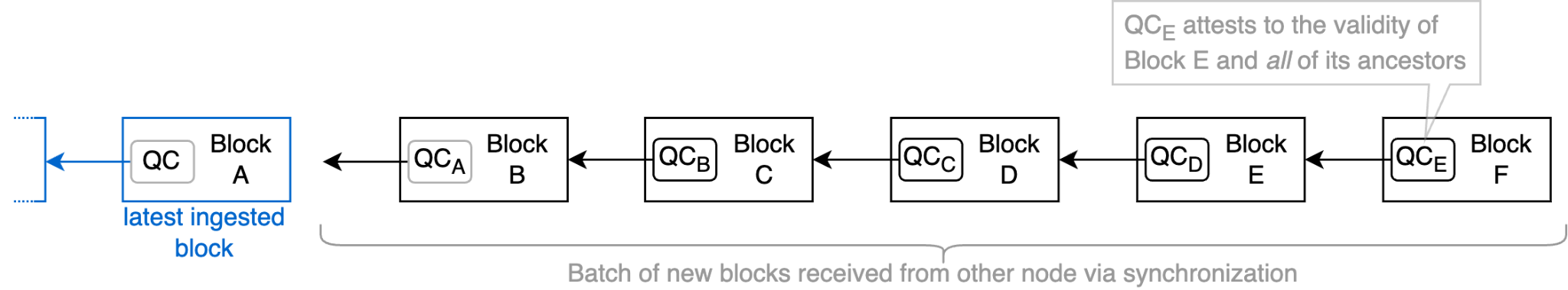 The new Follower can leverage this fact to avoid unnecessary work. When processing a sequential range of blocks, it is sufficient to ensure that the block at the end of the range is certified (and to check that the block hashes match). Hence, we only perform one expensive signature validation operation for the entire batch, instead of one for every block in the batch.