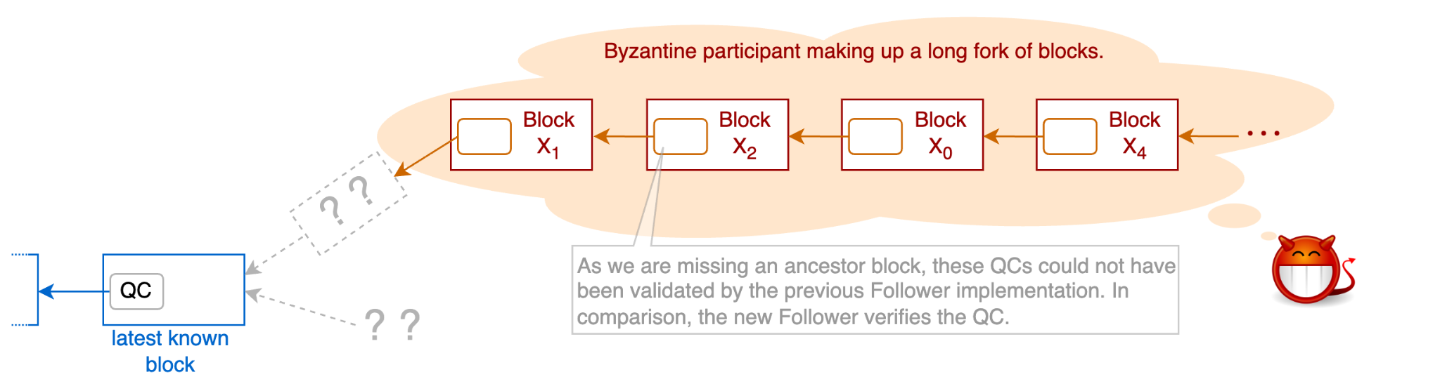 In the depicted example, Evil Edward — a Byzantine consensus participant — is making up a long fork of blocks. As these blocks are fake, they haven’t been voted on by the consensus committee and no valid QCs exist for them. Therefore, Edward includes invalid QCs in his fork. The previous Follower cannot assess whether the QCs in Edward’s fork are valid since the Follower does not know the full ancestry for the fork.