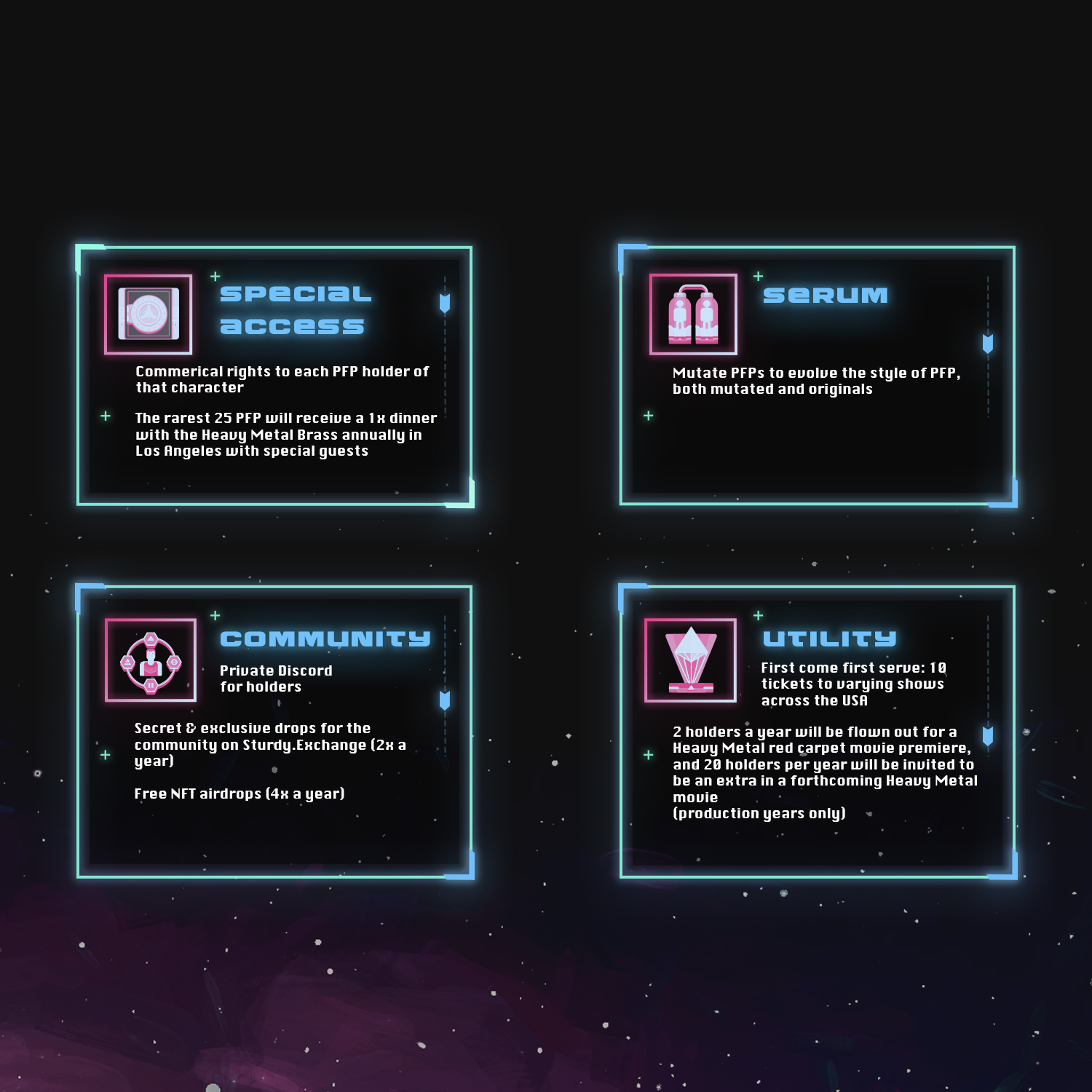 With the Analogs, this initial 10k collection will give holders access to a private Discord channel where they will work with the best Heavy Metal has to offer, and help create a brand new character with our art team. Once that character is created, a decision will have to be made. Keep your Analog and forgo this new creation, or burn your Analog, and jump on the evolutionary journey with this new being.