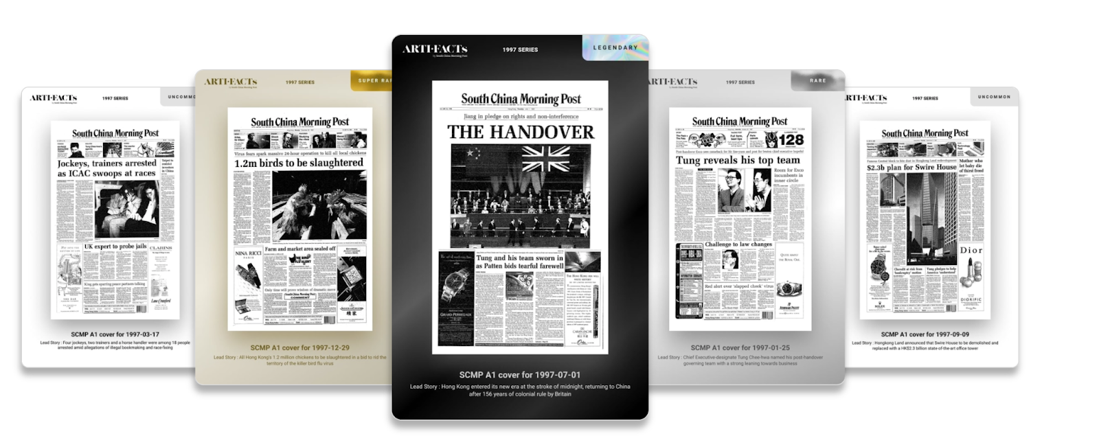 ARTIFACTs by SCMP is the first use case of the ARTIFACT metadata standard. Launching this month, our first drop, the 1997 Premium Series, will feature the front page of every issue published by SCMP in that year. Each of the 362 covers will be available to own, including our July 1st handover issue. Together with the animation and scanned image of our cover, the rich metadata captures the comprehensive context of all the stories on our front pages. As the original paper pages fade with time, the tokenized editions will forever preserve the stories that they tell, allowing history to be collected, discovered, and revisited.