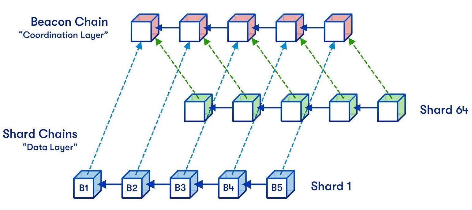 The idea of sharding is nothing specific to blockchain — database systems commonly use this type of horizontal scaling. The main thought behind this strategy is to split up the state of a blockchain into multiple smaller chunks and distribute them across nodes. The state is thus spread across multiple individual shard chains, while a central beacon chain takes care of coordinating and orchestrating these shard chains.