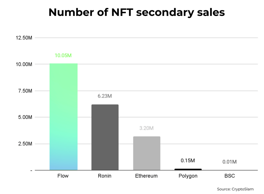 NBA Top Shot was the first blockchain-based product to reach over 1 million consumers, with over $80M in primary revenue and $750M+ via secondary marketplace where fans captured the majority of value. Up to this day, the average monthly sales and average monthly traders are higher than those of Axie Infinity, Sorare, Bored Ape Yacht Club and CryptoPunks combined, and NBA TopShot is certainly one of the reasons why Flow already has a higher number of secondary sales than WAX, Ronin, Ethereum or Polygon.