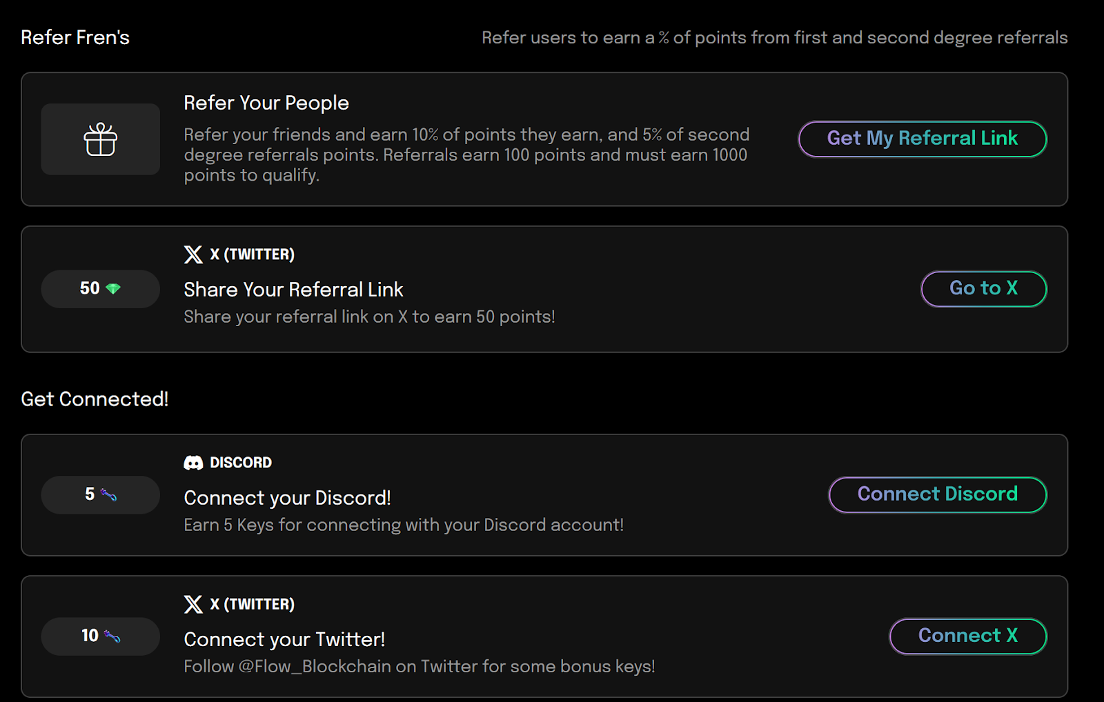 Earn points by completing daily/weekly check ins, following Flow projects, referring your friends, sharing updates, or participating in community activities. Stay active, have fun, and get rewarded. The Social Quests are updated weekly so when you complete your daily check in (which earns you 5 points) be sure to check in on the Social Quests as well.
