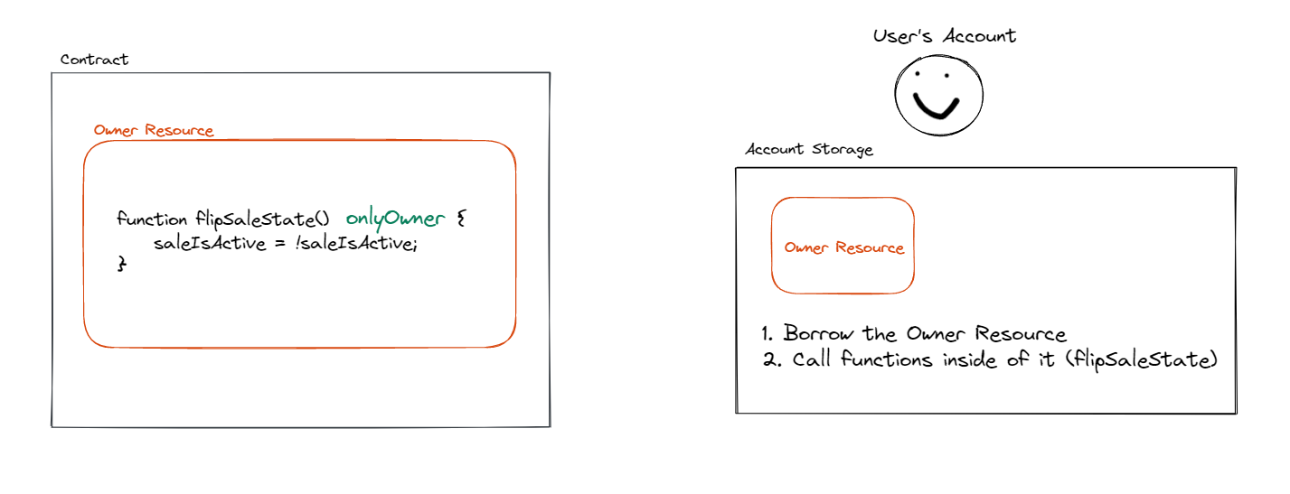 Cadence however has built-in access control through the use of resources, access modifiers, and capabilities. We can define a resource (object) called Owner and store it in the owner’s account storage, allowing them to borrow a reference to it and flip the sale state at any time and removing the need for 3rd party libraries like OpenZeppelin. It looks something like this: