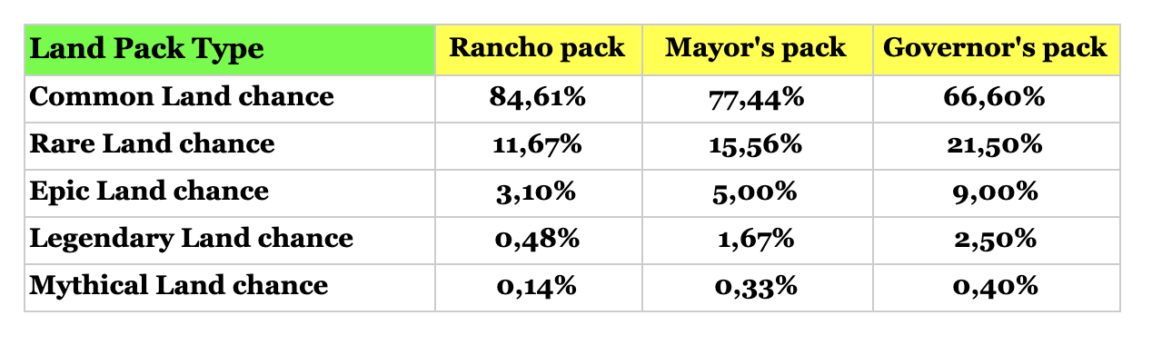 Higher tier packs will provide increased chances for you to get a land plot with a higher rarity! Here’s a breakdown of how land rarity will be distributed across pack types: