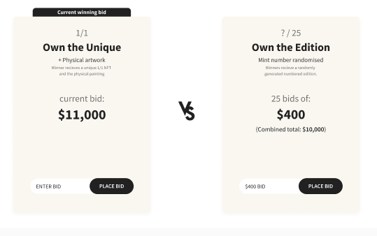 One NFT (1/1) is then minted on the Flow Blockchain and subsequently sent to the person with the highest bid on the unique piece. If the sum of all the bids on the edition side is higher than the single bid on the unique side, the edition side will win. Multiple NFTs matching the edition size are then minted and sent to the winners. These buyers can bid on specific serial numbers, and will then receive the serial number(s) where they have the highest bid(s) (assuming the edition side wins).