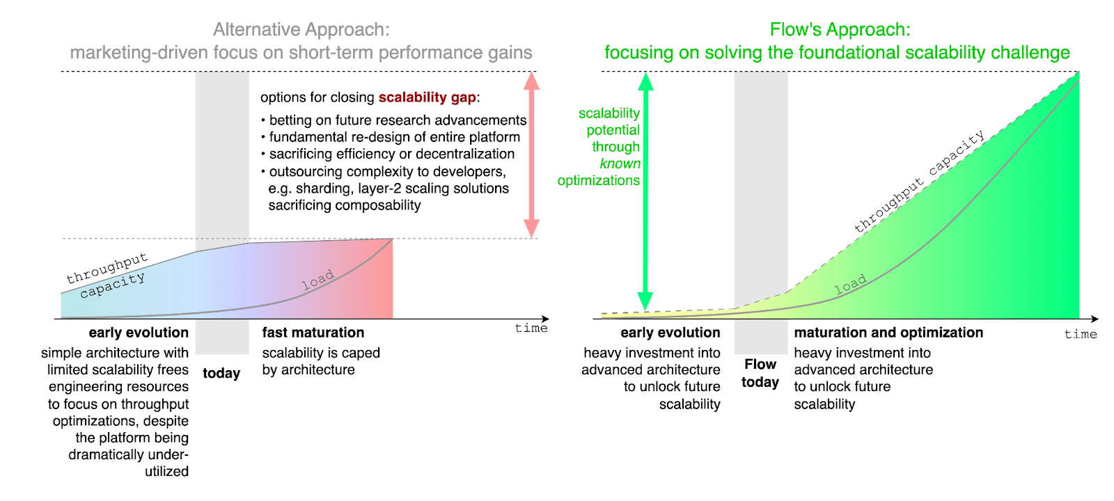 Currently, app developers have to make scaling decisions that impact their user experience and technical implementations. The path for scaling many networks requires splitting the chain to layer 2’s and layer 3’s where Flow has a fully integrated protocol while at its core using the same principles with different roles across nodes. High throughput and low latency are crucial for applications requiring rapid and reliable performance, and Flow delivers just that.