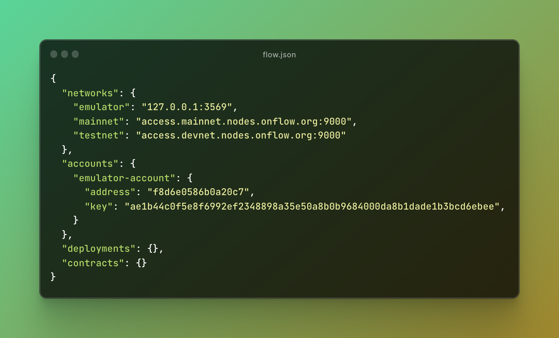 The flow.json file contains the configuration of your project. There, we define contracts we will deploy, accounts we created on the network, and different networks we can access. Flow.json is consumed by other tools and libraries (such as FCL) and is a glue between consumers. You can read more about flow.json here.