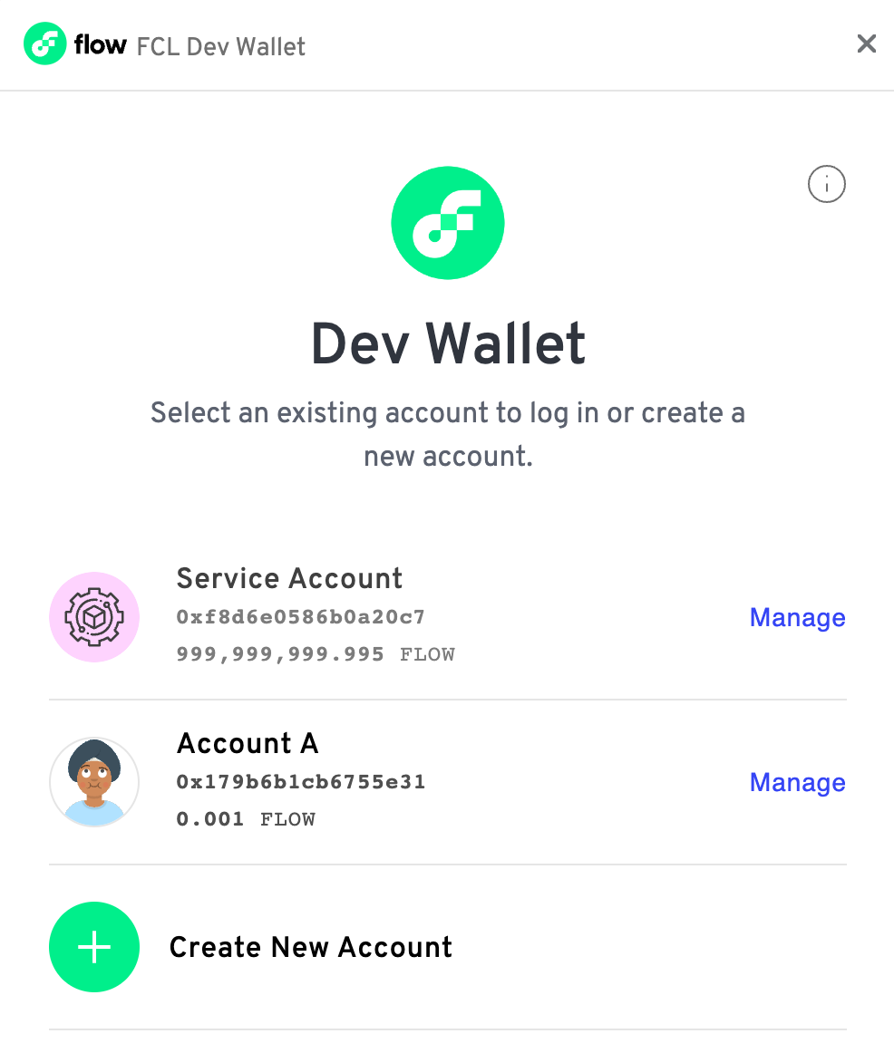 Dev wallet is a tool that emulates an FCL-compatible wallet locally. It implements specific APIs the FCL needs to communicate with it and sign the transactions. The dev wallet automatically generates a wallet you can use during development. For now, you can think of it as a black box tool that enables you to sign any transaction as a user would on production deployment. Of course, on production, the dev wallet would be replaced with any production wallet providers such as Blocto or Lilico wallet.