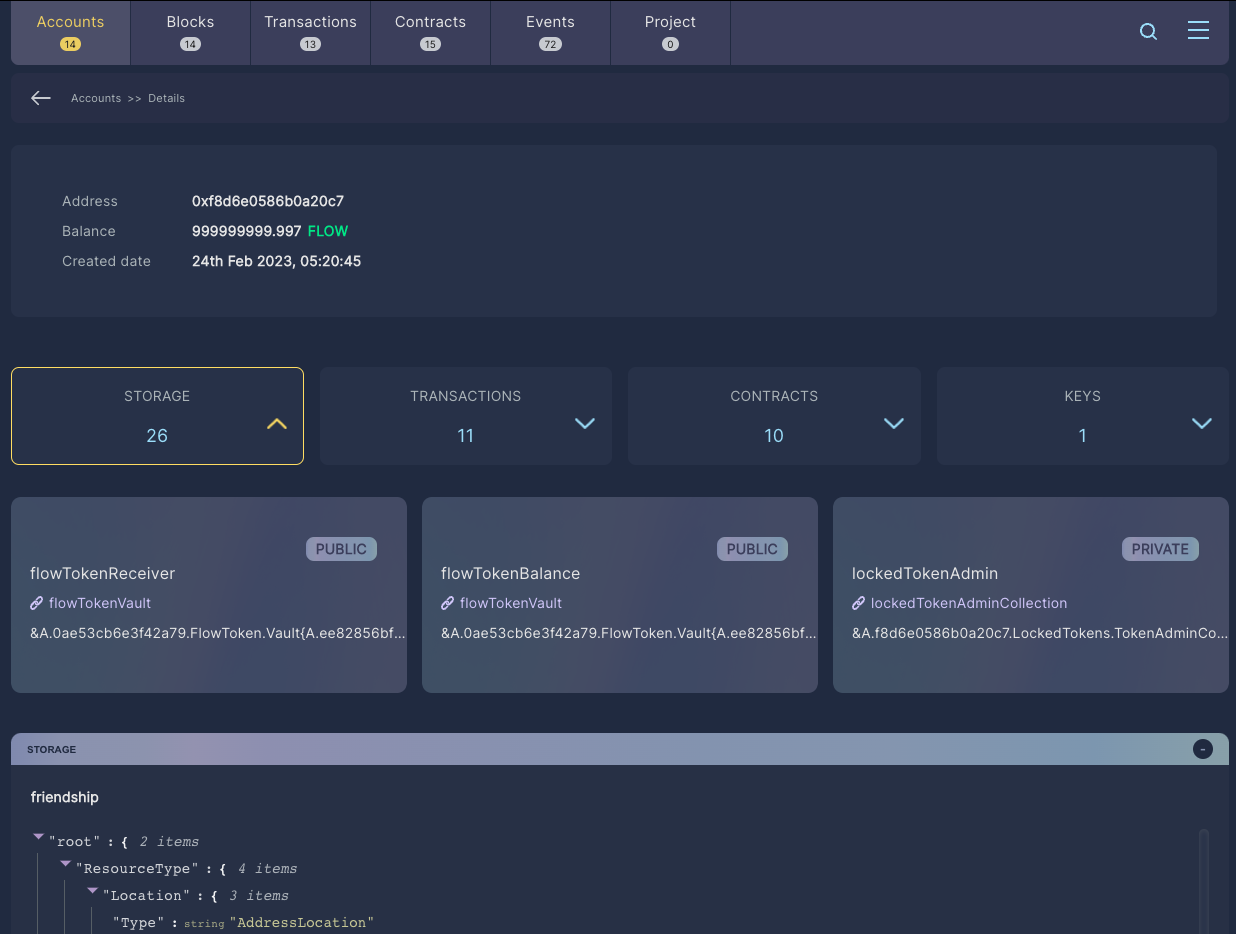 Let’s look into Flowser, find the above account, and check the storage. We can see there indeed is a “friendship” resource in the storage section.