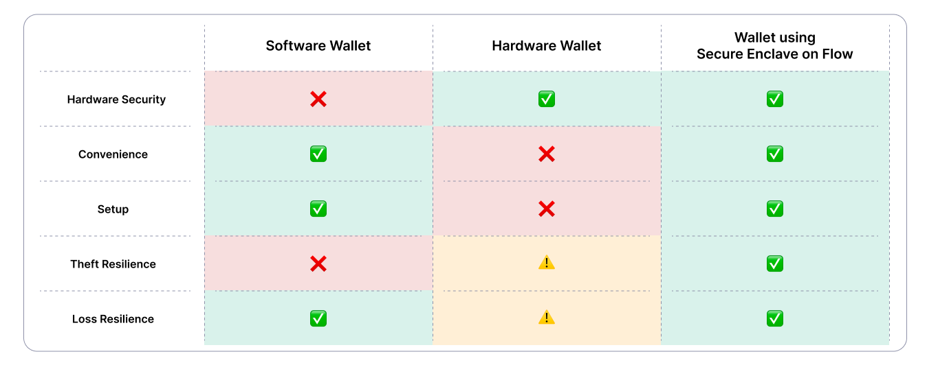 On Flow, crypto wallets can use Secure Enclave to provide security on par with hardware wallets without compromising on accessibility and convenience. These wallets can be fully customized to support different types of recovery mechanisms.