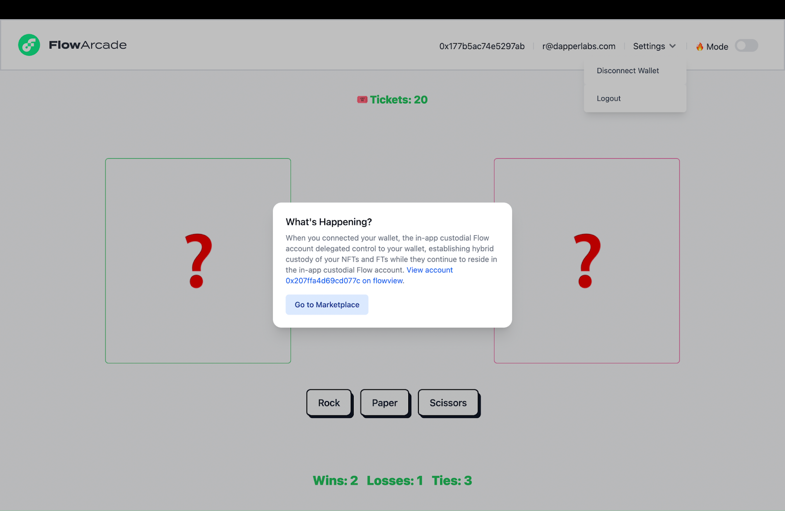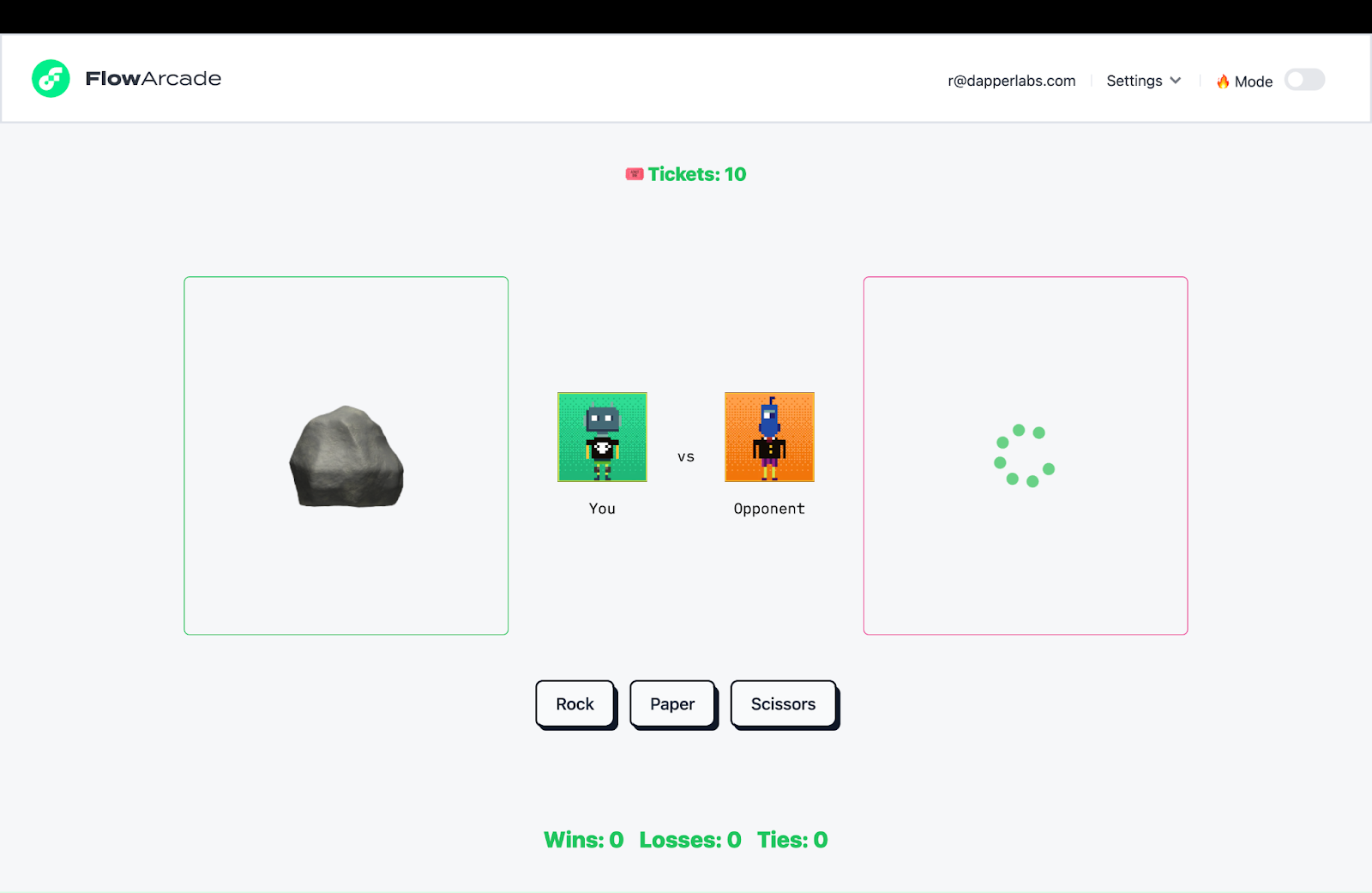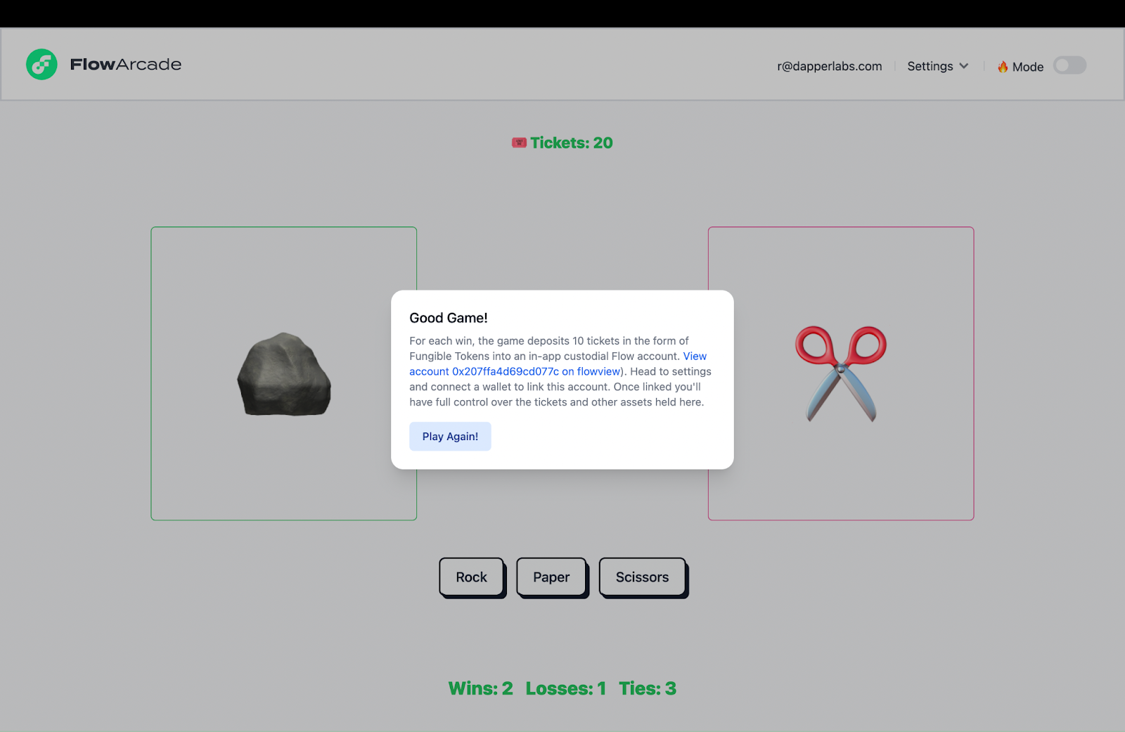 Now, the user gets an opportunity to experience the game before ever being asked to take any additional steps. In this example, they play a few rounds of the classic game Rock, Paper, Scissors. For every win, the player receives 10 fungible tokens that function as arcade tickets in the game.